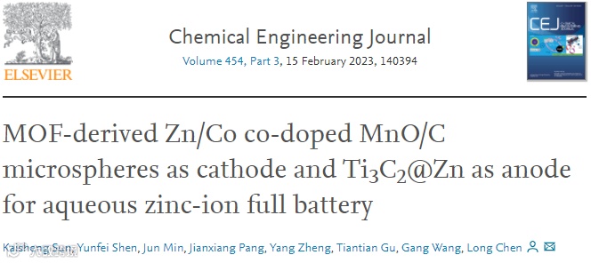 K. Sun, Y. Shen, J. Min, J. Pang, Y. Zheng, T. Gu, G. Wang, L. Chen, MOF-derived Zn/Co co-doped MnO/C microspheres as cathode and Ti3C2@Zn as anode for aqueous zinc-ion full battery, Chem. Eng. J. 454 (2023) 140394, DOI: 10.1016/j.cej.2022.140394.