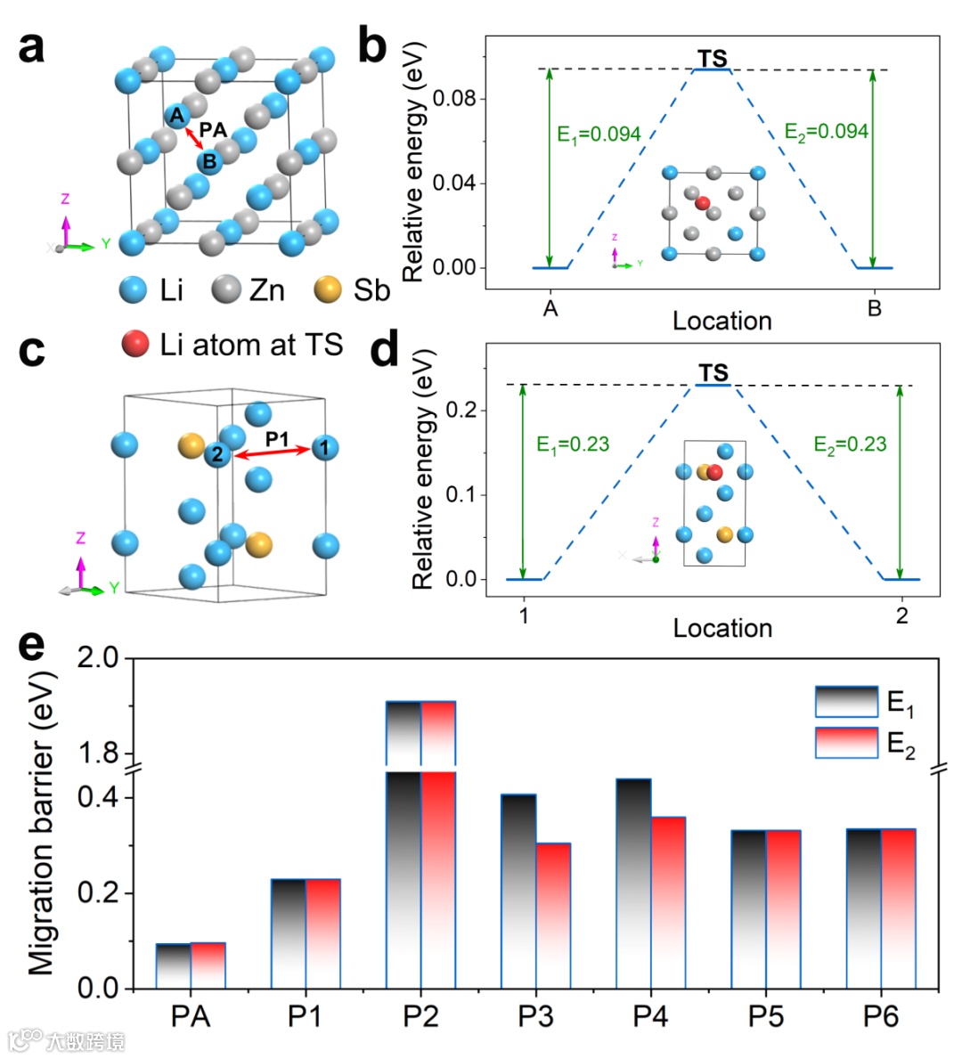 图4. Li在LiZn和Li3Sb中迁移路径和迁移能垒