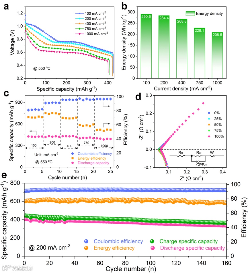 图1. Li||Sb30Zn70电池电化学性能。不同电流密度下的放电曲线(a)、能量密度(b)和效率、比容量特性(c);(d)不同放电深度的电化学阻抗;(e)长循环性能