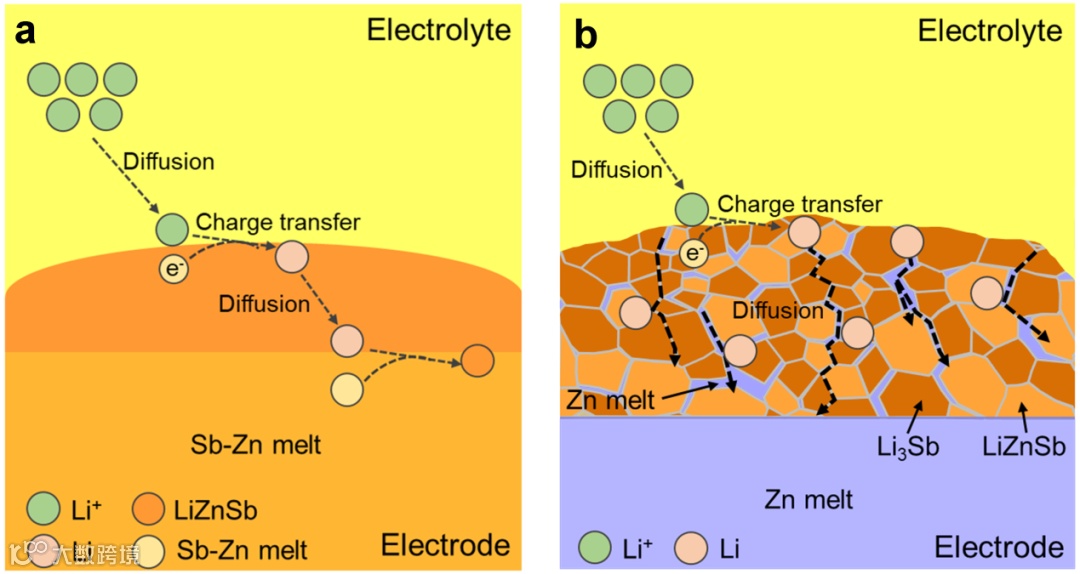 图5. Li||Sb-Zn电池在第一(a)和第二(b)电压平台处反应机理模型