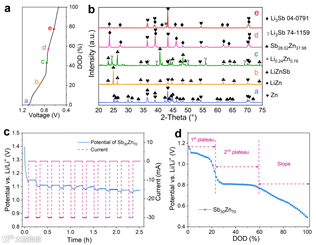 图2. Li||Sb30Zn70电池电极反应过程研究。(a-b)Sb30Zn70电极XRD测试结果;(c-d)Li||Sb30Zn70电池库仑滴定结果