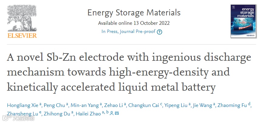 该研究以题目为“A novel Sb-Zn electrode with ingenious discharge mechanism towards high-energy-density and kinetically accelerated liquid metal battery”的研究性论文发表在国际知名期刊《Energy Storage Materials》(IF=20.831),北京科技大学博士生谢宏亮为本文第一作者。