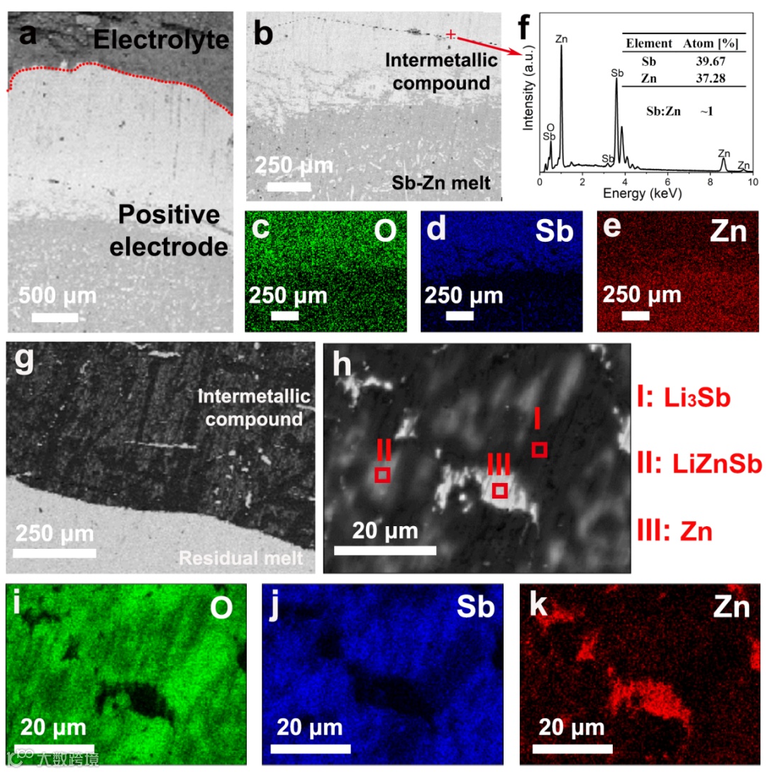 此外在金属间化合物层检测到金属Zn的弥散分布,基于电极反应过程分析,其产生于LiZnSb向Li3Sb的相演变过程。由于金属Zn具有较低的熔点,在运行温度下为液态,并且具有良好的导电性和储锂能力,因此锂离子在正极-电解质界面得电子后进入金属间化合物层,可以与Zn熔体合金化形成Li-Zn非平衡熔体,充当锂快速扩散通道,促进Li向金属间化合物深处的扩散,进而导致金属间化合物各物质的弥散分布。