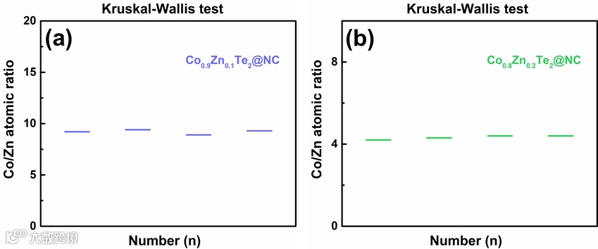 为探究Zn的不同掺杂量对电催化剂本征催化性质的影响,我们同时制备了CoTe2@NC,Co0.9Zn0.1Te2@NC和Co0.8Zn0.2Te2@NC三种电催化剂。通过电感耦合等离子质谱仪(ICP)元素分析及统计分析的非参数检验方法验证了不同批次的样品高度可重复性,表明我们可通过元素比例调控实现对电催化剂的精准调控。