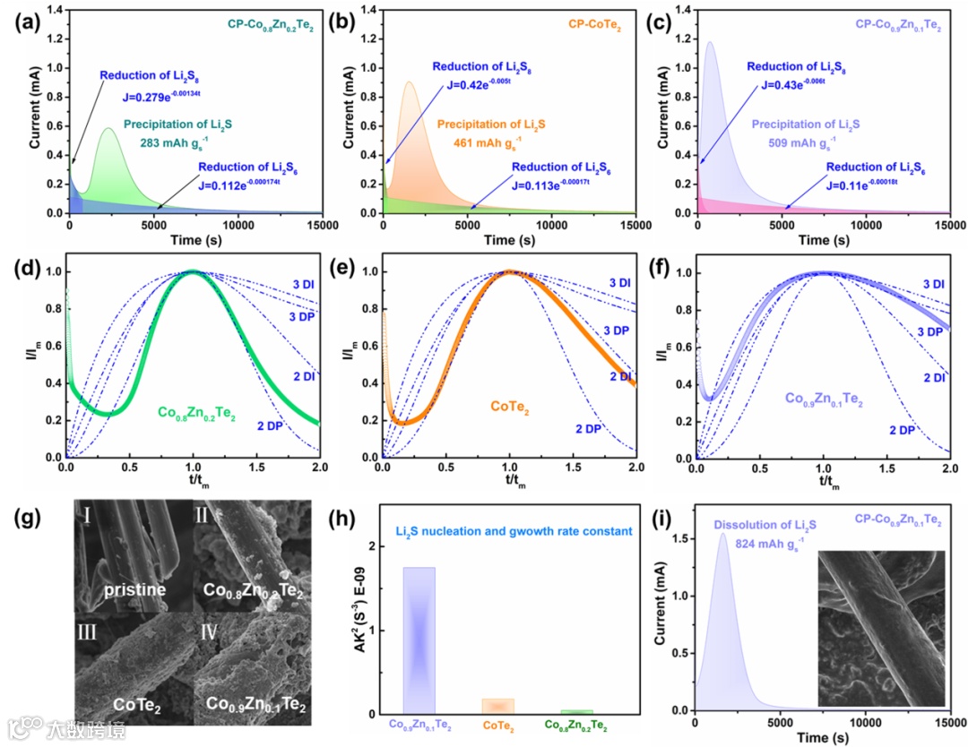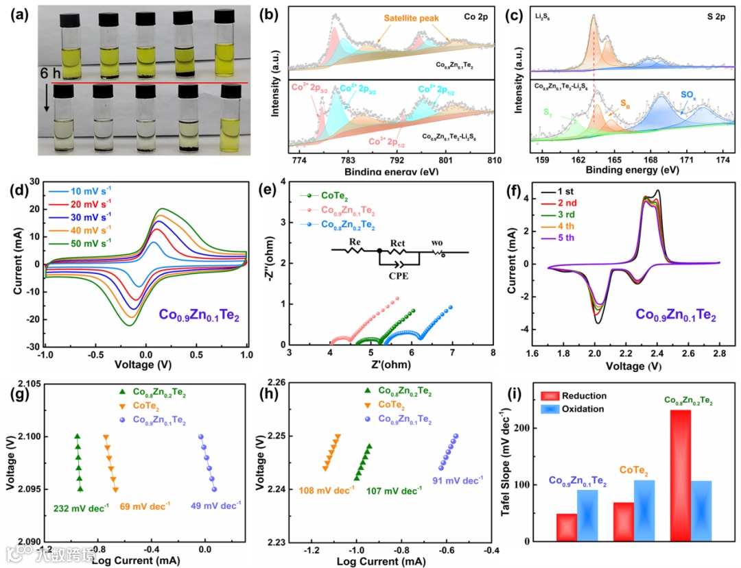 根据成核模型,硫化锂在Co0.9Zn0.1Te2@NC中的成核方式呈现3DP模式,说明其成核不受晶面影响,更容易成核生长。除了硫化锂沉积过程外,溶解速率也尤为重要,充电过程中硫化锂的快速氧化溶解可以避免低活性硫化锂的积累和电催化剂活性位点的堵塞。图4i则直观的表明含有Co0.9Zn0.1Te2@NCC的碳纤维纸表面非常光滑,硫化锂完全溶解,表明Co0.9Zn0.1Te2@NC电催化剂优异的双向氧化还原特性。