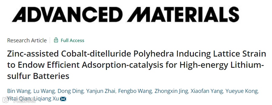 Zinc-assisted Cobalt-ditelluride Polyhedra Inducing Lattice Strain to Endow Efficient Adsorption-catalysis for High-energy Lithium-sulfur Batteries, Advanced Materials, 2022, DOI: 10.1002/adma.202204403.