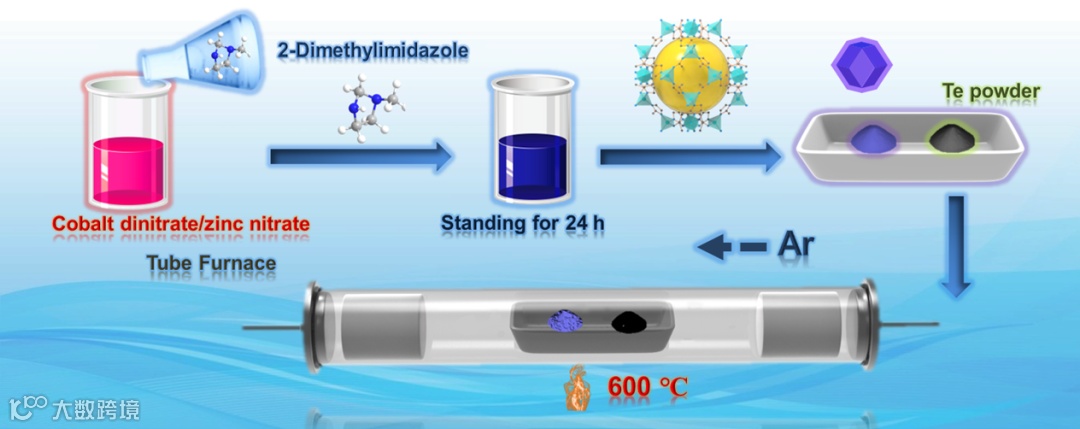 图1. Co0.9Zn0.1Te2@NC多面体电催化剂制备流程图