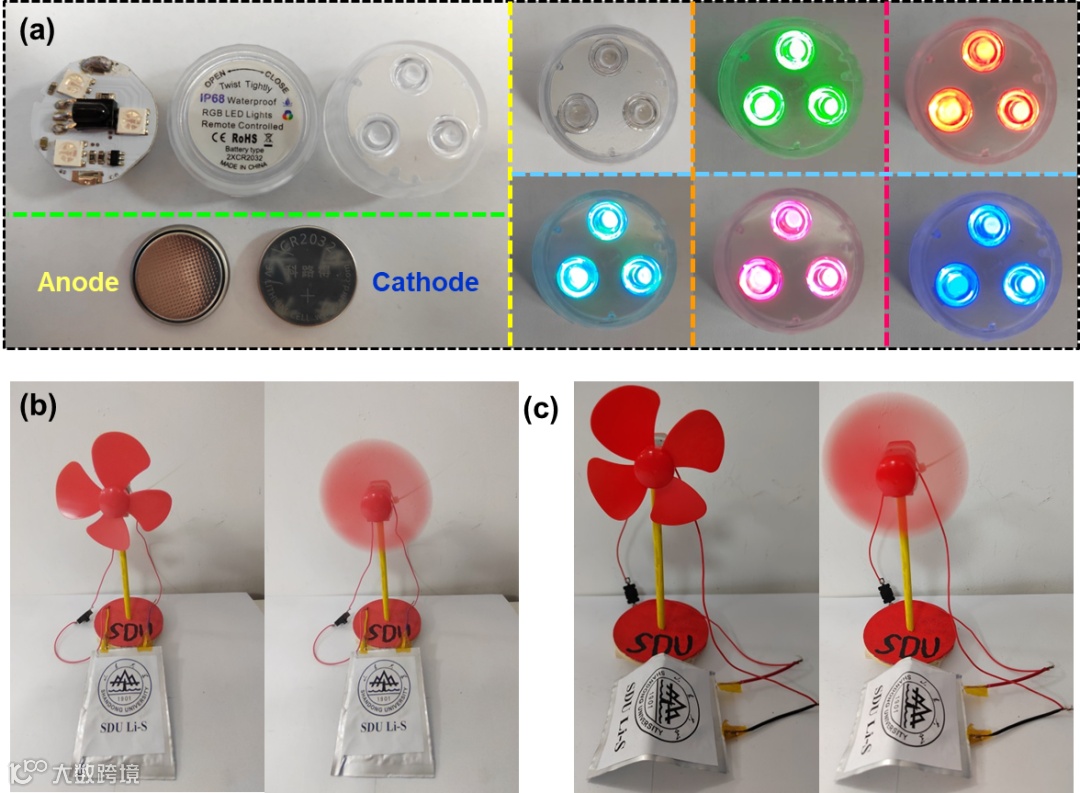 在高载量和贫液条件下的扣式电池展现出优异的性能,同时我们将其放置在商用灯具中,其可以稳定工作数小时。在软包电池条件下,可以驱动小风扇进行工作,并在弯折下也能进行工作,表现出良好的柔韧性,具有优异的商用化价值。