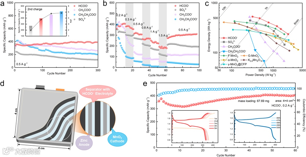 图6. 含不同阴离子电解液的电池电化学性能。(a)0.5 A g−1时的循环性能和(b)不同电流密度下的速率性能。(c)与其他水性锌电池相比,不同电解质的Ragone图。(d)三层正极和两层负极的多层软包装电池示意图和(e)相应循环性能。