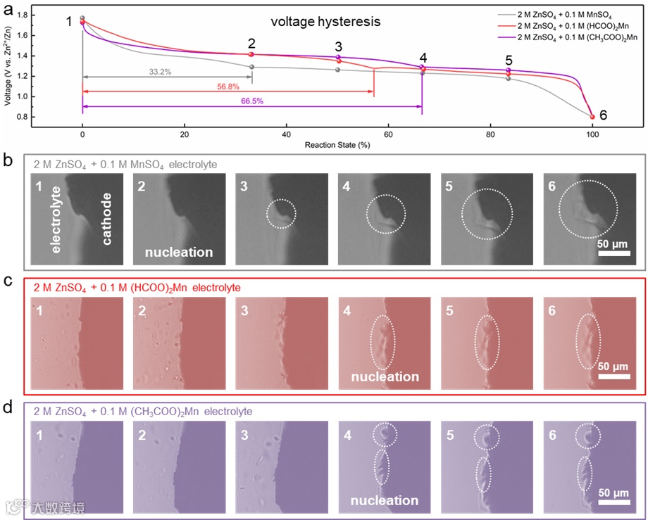 图3. 原位光学显微镜观测正极/电解液界面羟基硫酸锌的生成对电化学行为的影响。(a)放电曲线和在(b)2 M ZnSO4+0.1 M MnSO4、(c)2 M ZnSO4+0.1 M (HCOO)2Mn和(d)2 M ZnSO4+0.1 M (CH3COO)2Mn电解质中原位显微镜观察的ZHS成核和生长。
