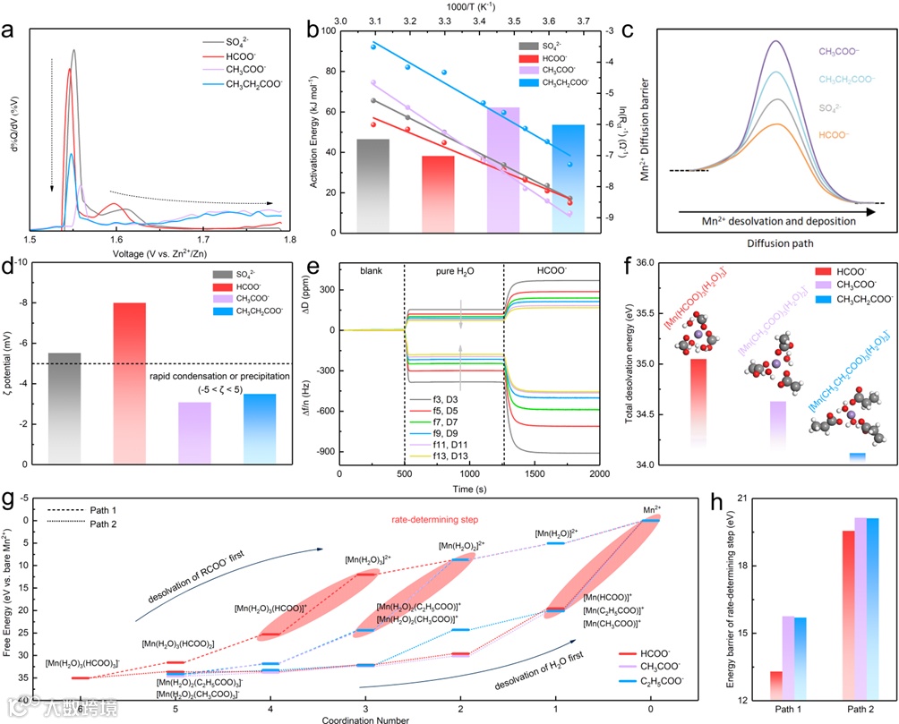 图5. 对界面离子吸附、扩散和脱溶剂化过程的动力学角度阐述。(a)d%Q/dV曲线,(b)计算的表面反应活化能,(c)不同羧酸阴离子电解质中Mn2+脱溶-沉积反应过程能垒示意图。(d)不同阴离子电解质中MnO2的ζ电位。(e)含有甲酸盐阴离子的电解质中的QCM-D数据。(f)不同羧酸阴离子溶剂化Mn2+的总脱溶能。(g)Mn2+脱溶反应路径和(h)限速步骤的能垒。