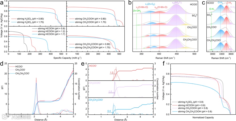图4. 对H+的缓冲效应和对Mn2+的络合效应的热力学角度阐述。(a)不同pH值的过量搅拌纯酸溶液中的正极首次放电曲线。(b)325–510 cm−1和(c)2800–3750 cm−1处电解质的拉曼光谱。MD模拟中(d)Mn-O对和(e)Mn-O(羧酸阴离子)的RDF。(f) 在相同pH值为0.80的过量搅拌纯酸性电解质中的首次放电曲线对比。