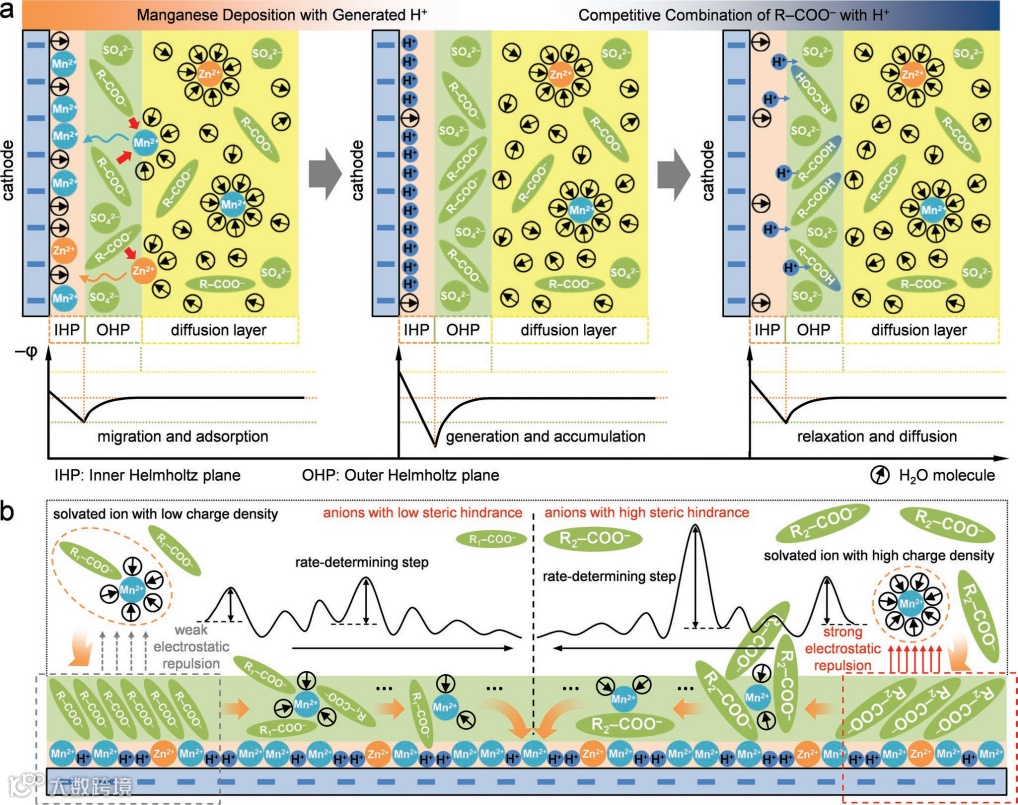 微分曲线和活化能测试显示出甲酸根阴离子诱导的低极化现象。ζ电位和石英晶体微天平测试结果表明这一方面是因为甲酸根阴离子更倾向于吸附在正极表面并屏蔽一部分的界面电场排斥;另一方面,根据脱溶剂化过程计算,不同于以往的总脱溶剂化能决定整体动力学性能的观点,反应期间的决速步骤才是决定整个界面过程的动力学性能。