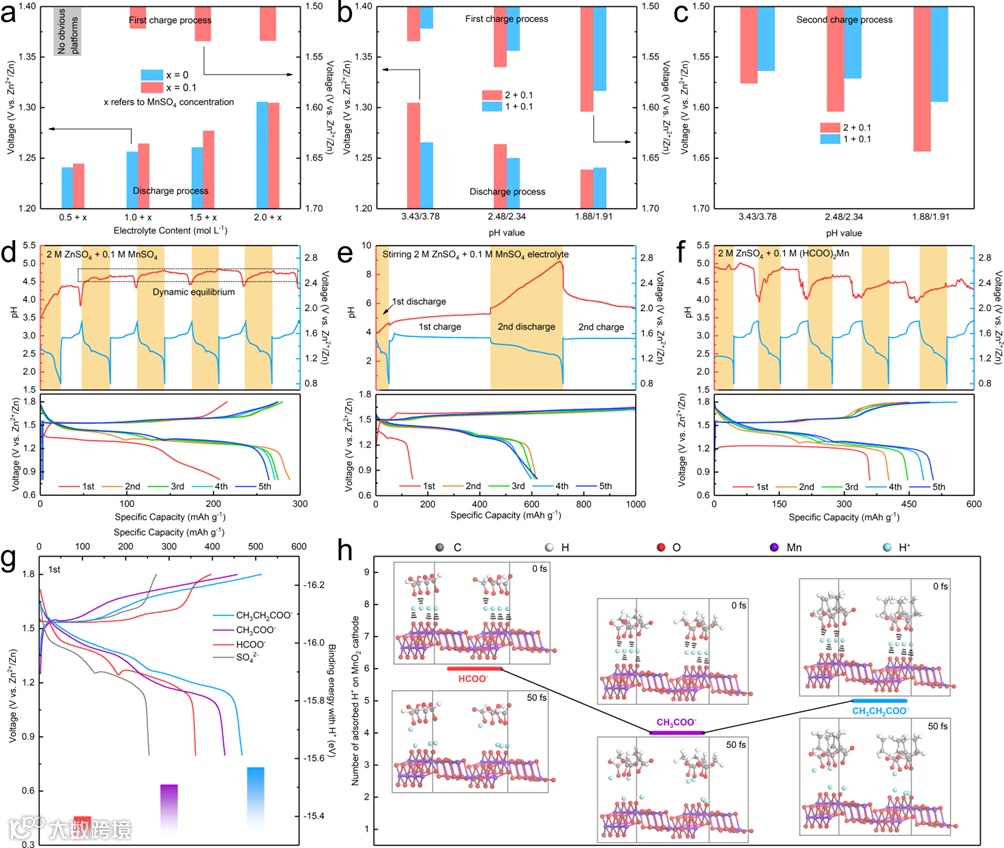 图2. 电解液离子浓度对电化学行为的影响。(a)0.5/1.0/1.5/2.0 M ZnSO4+0/0.1 M MnSO4和(b)1.0/2.0 M ZnSO4+0.1 M MnSO4+H2SO4中第一个充电和放电平台的电压。c)1.0/2.0 M ZnSO4+0.1 M MnSO4+H2SO4中第二充电平台的电压。(d)静态和(e)搅拌2 M ZnSO4+0.1 M MnSO4和(f)静态2 M ZnSO4+0.1 M (HCOO)2Mn电解质中正极附近的原位pH检测。g)不同羧酸阴离子下的充放电曲线以及与H+的相应结合能。h)含有不同的羧酸阴离子的电解质中界面H+吸附模拟。