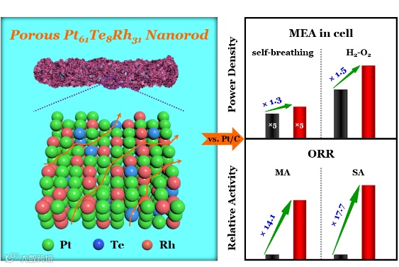 该研究文章设计合成了一种新型的多孔Pt-Te-Rh纳米棒,同时具有一维的框架结构和三维开放的表界面,能够作为高效ORR 催化剂用于质子交换膜燃料电池,在自呼吸氢气/空气模式和传统氢气/氧气两种运行模式下均实现了出色的性能。