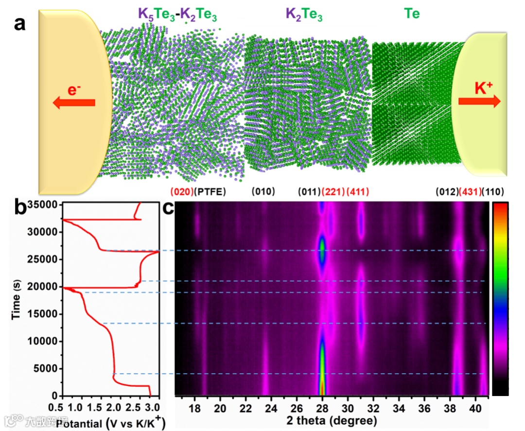 图5. a)Te NW的钾化示意图。由于合金化反应,在钾化过程中出现了三种不同的相。(b) 在 0.05 A g-1电流密度下的充放电曲线。(c) 在 16°–41° 范围内采集的二维原位 XRD 图。