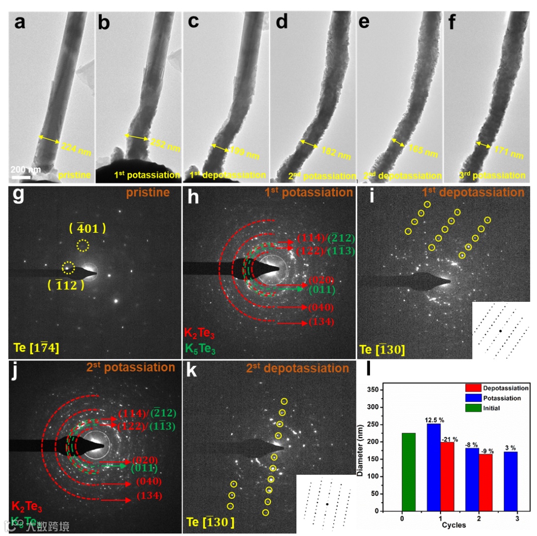 图6. a-f) 在前三次钾化/脱钾化过程中 Te纳米线的微观形貌演变。g-k) Te纳米线在前两次钾化/脱钾化过程中的SAED图像。l) Te NW 的测量直径与循环次数的关系图。