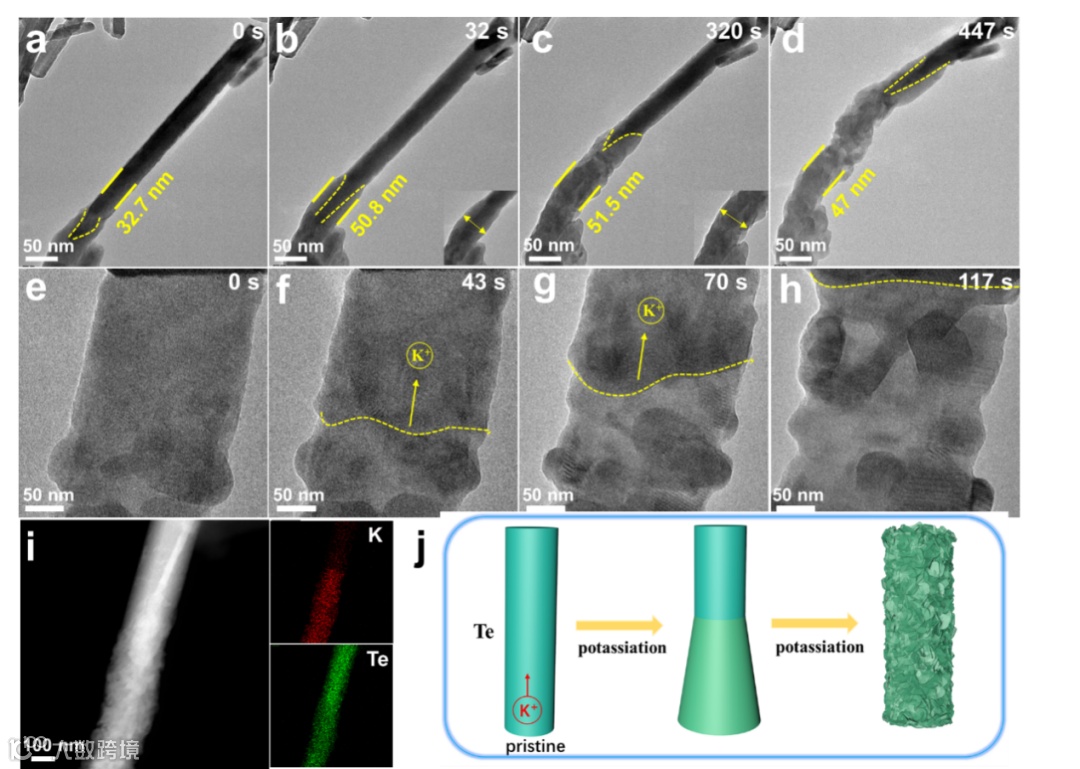 图1.a-d) K-Te随时间原位钾化转变过程;e-h)K-Te在高倍下随时间原位钾化转变过程;i) 钾化后的HAADF-STEM图像以及对象的元素mapping图;j)Te纳米线的钾化示意图。