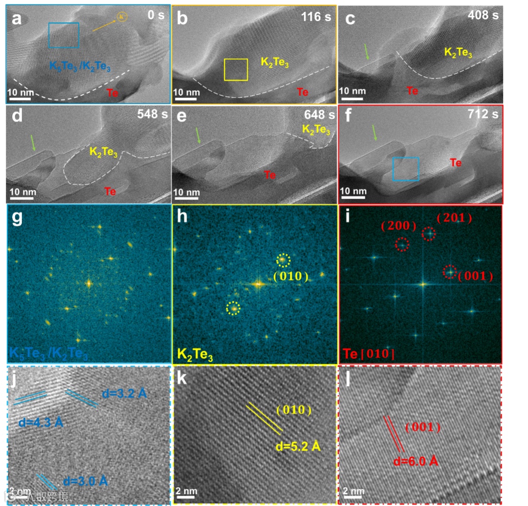 图4. a-f) Te脱钾过程的实时HRTEM 图像。g-i) 为a,b,f图中的正方形区域的FFT 图像和 j-l) HRTEM 图像。