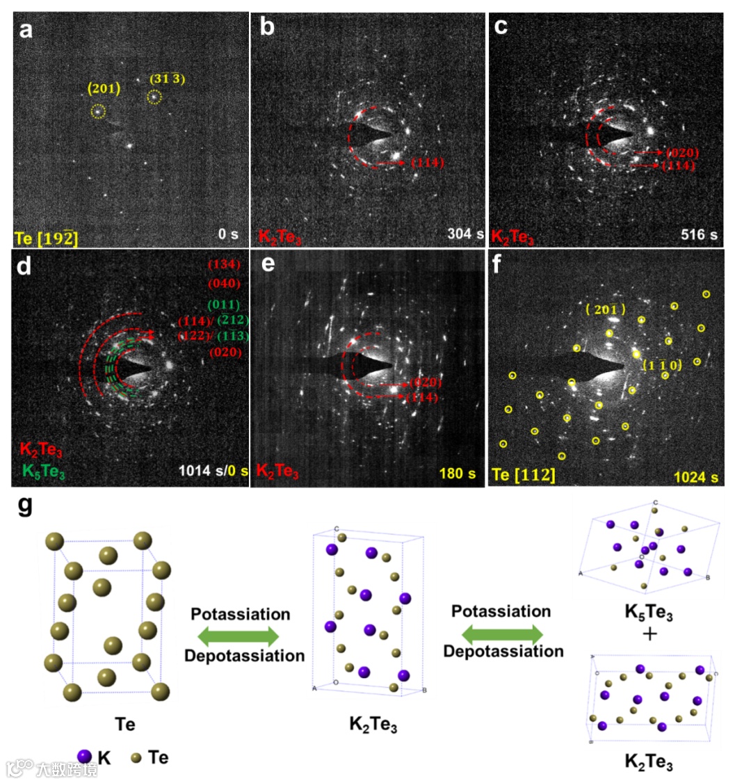 图2. a-d). Te纳米线在钾化过程中的实时电子衍射花样变化图;d-f) Te纳米线在脱钾过程中的实时电子衍射花样变化图;g)钾化过程和脱钾过程的原子结构示意图。