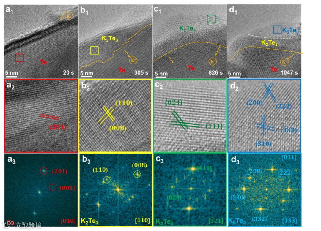 图3. a1-d1) Te钾化过程的实时HRTEM 图像,这是图 S5a 中红色方块标记的区域的放大图。a2-d2) 为a1-d1图中的来自正方形区域的HRTEM 图像和 (a3-d3) FFT 图案。