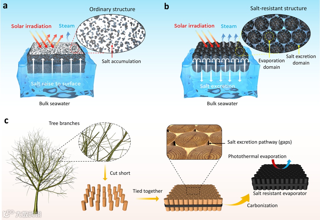 图1:通过微观结构单元便捷的组装构建抗盐蒸发器的示意图。(a)传统蒸发系统示意图。(b)微结构单元组装的抗盐蒸发系统示意图。(c)快速组装碳化树枝简便制备抗盐蒸发器示意图。