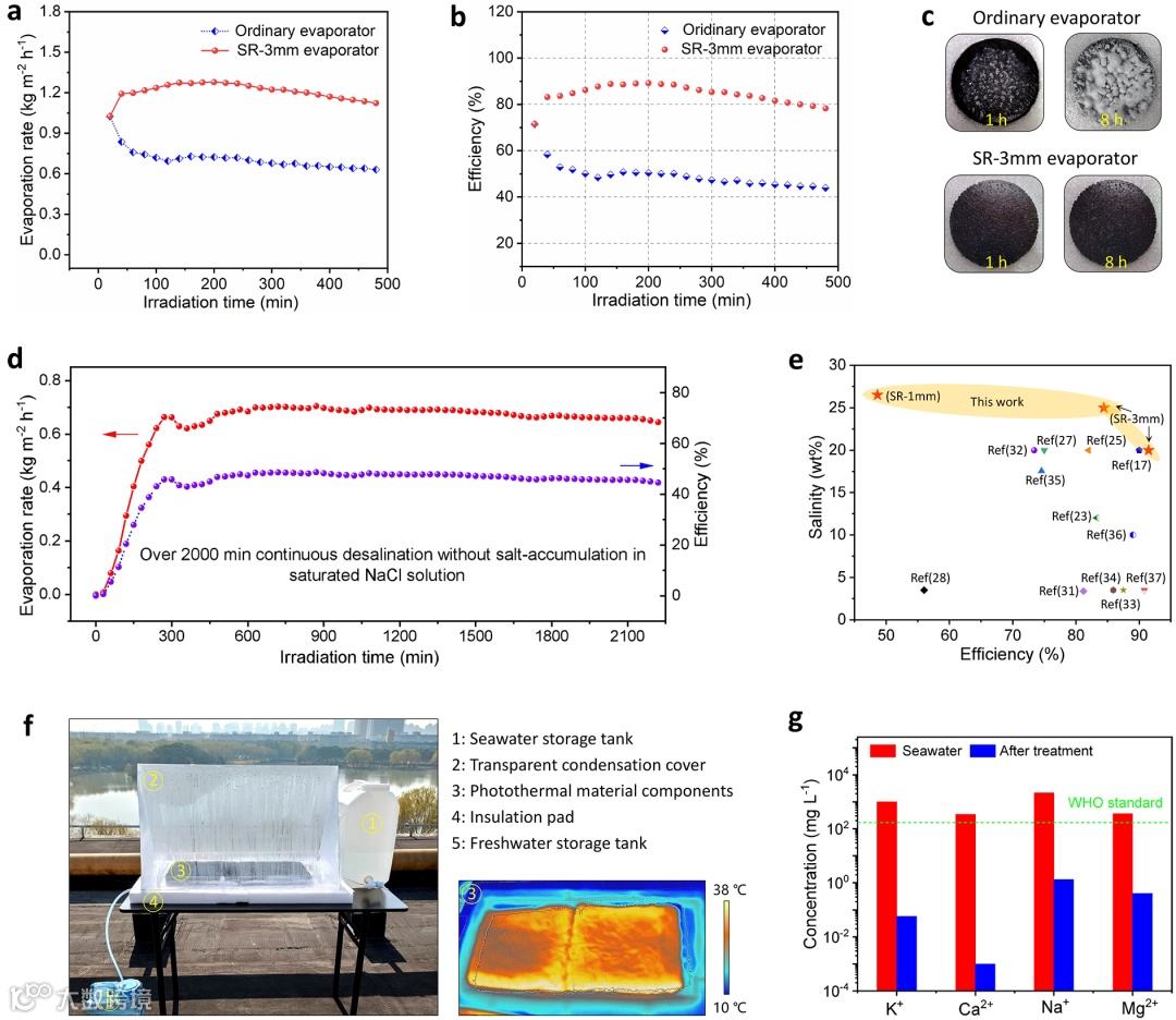 图4:抗盐结构蒸发器的太阳能蒸发性能评估。(a)抗盐蒸发器和普通蒸发器在高达25wt%盐水中的蒸发速率。(b)抗盐蒸发器和普通蒸发器在高达25wt%盐水中的能量效率。(c)抗盐蒸发器和普通蒸发器在25wt%盐水中的表面照片。(d)SR-1mm蒸发器和普通蒸发器在过饱和盐水中的蒸发速率和效率。(e) SR蒸发器的效率和耐盐性与其他报道文献的比较。(f)大型抗盐结构海水淡化系统的部件及其在室外条件下的运行。(g)大型抗盐结构海水淡化系统产生的淡水与处理前的水质比较。