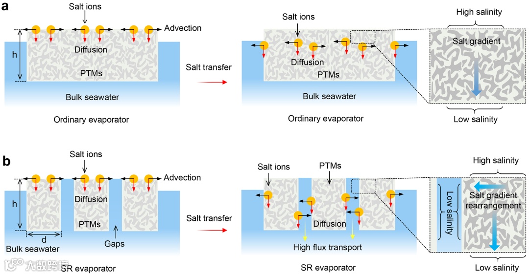 图3:不同结构蒸发器的盐离子传输机制示意图。(a)普通蒸发器中的盐梯度分布以及盐梯度引起的盐离子的垂直扩散和平流扩散路径分布。(b)抗盐蒸发器间隙引起的盐梯度重排,以及重排盐梯度引起的盐离子垂直扩散路径的改变和平流扩散效应的增强。