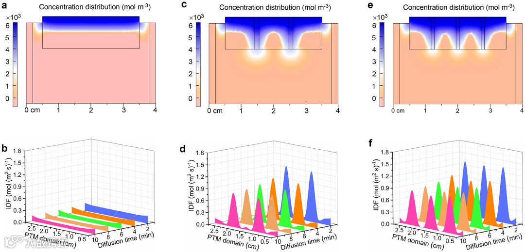 图2 |在多孔介质域中模拟的抗盐结构对浓盐水的扩散。(a) 盐排泄过程(扩散1min,下同)中普通结构的光热材料内盐的浓度分布。(b) 普通结构的光热材料内溶质的瞬时扩散通量(IDF)(数据取自光热材料与海平面的切线,下同)。(c) 盐排泄过程中抗盐结构(粗化模型)光热材料内盐的浓度分布。(d) 粗化抗盐结构的光热材料内溶质的IDF。(e) 盐排泄过程中抗盐结构(细化模型)光热材料内盐的浓度分布。(f) 精细抗盐结构的PTM内溶质的IDF。