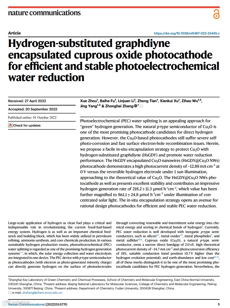 光电化学裂解水是一种非常有吸引力的“绿色”制氢方法。天然p型半导体Cu2O是一种非常有前景的直接产氢的光电阴极材料。然而,基于Cu2O的光电阴极材料仍然存在严重的光腐蚀和表面电子-空穴快速复合的问题。在此,我们提出了一种简单的原位包覆策略,用氢取代石墨烯(HsGDY)保护Cu2O,同时提高其裂解水的性能。