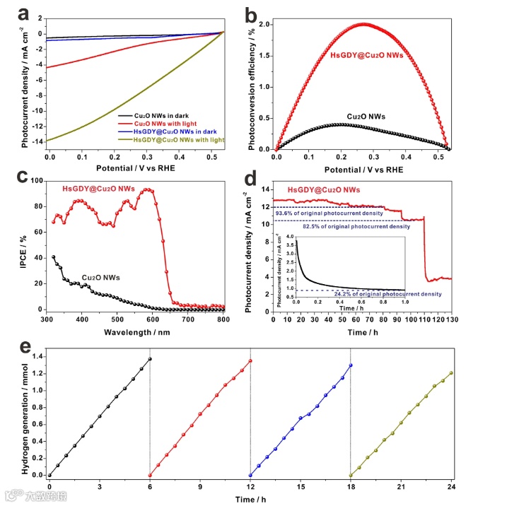 图2:HsGDY@Cu2O NWs光电阴极的PEC性能