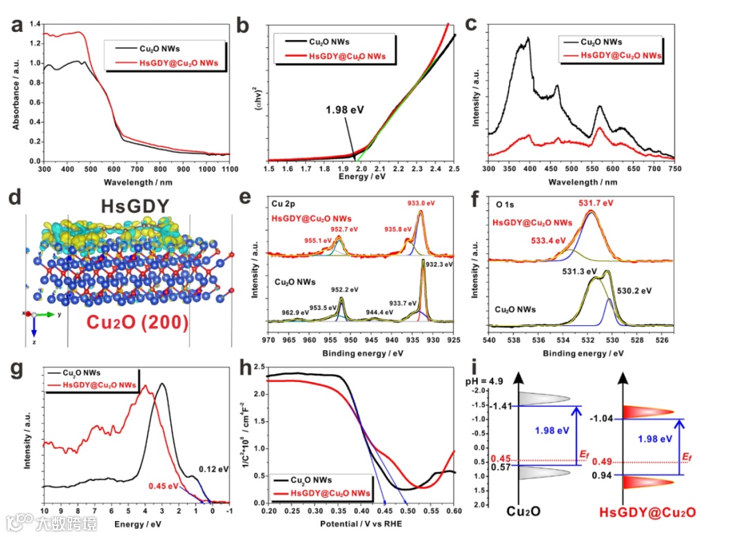 Cu2O经HsGDY包覆后,在531.7 eV处的强峰表明Cu-O-H结构的形成,这表明HsGDY中的氢与Cu2O中的氧之间的连接占主导地位。Cu2O NWs和HsGDY@Cu2O NWs的能带能结构图如图3i所示,相比于Cu2O,HsGDY@Cu2O材料中Ef和VB的距离进一步增大,表明其具有较高的电子云密度,这一结果可归因于离域π-电子的存在和Cu2O与HsGDY之间有效电子转移。