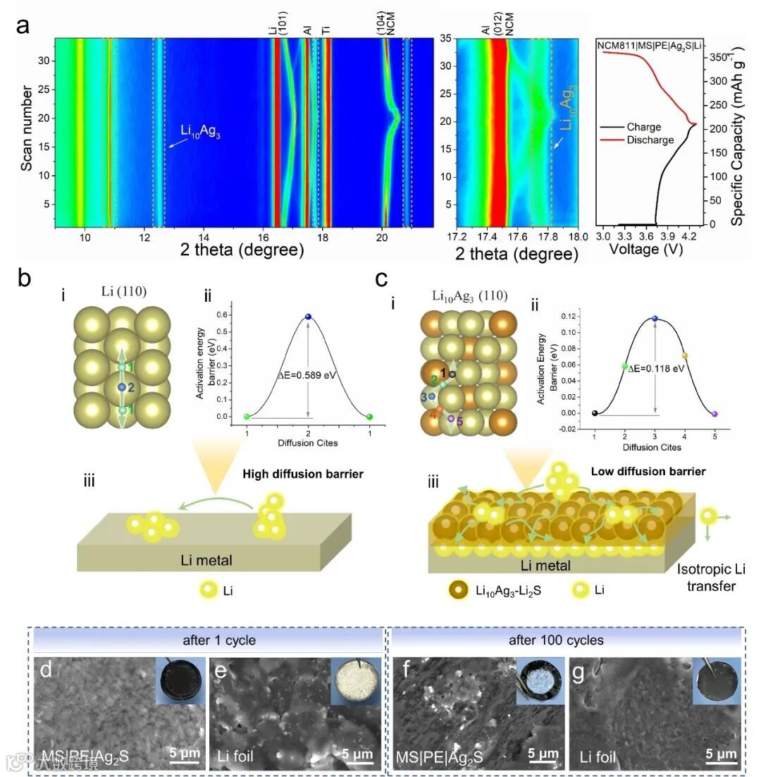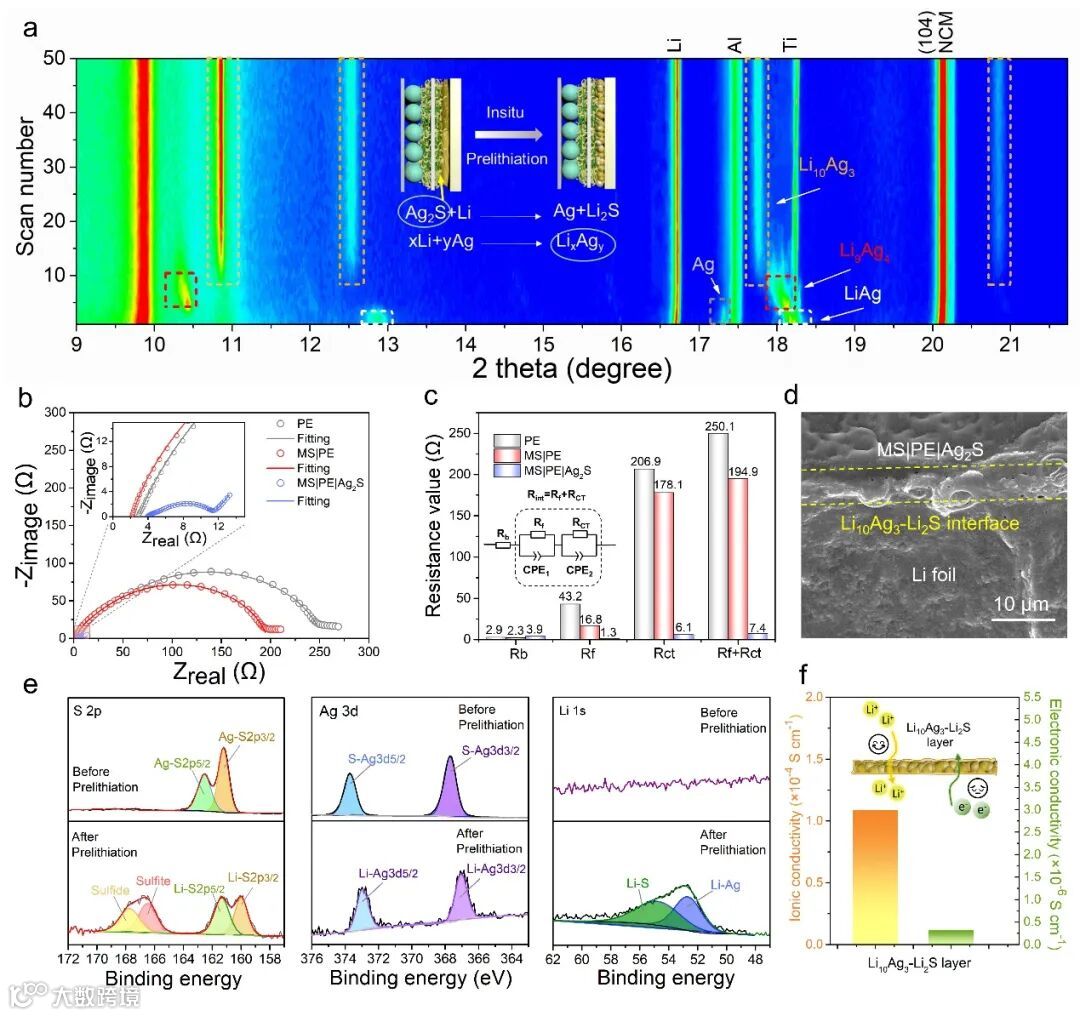 图3. MS|PE|Ag2S隔膜中Ag2S涂层与锂负极接触时界面演化行为及其界面离子传输性能表征。