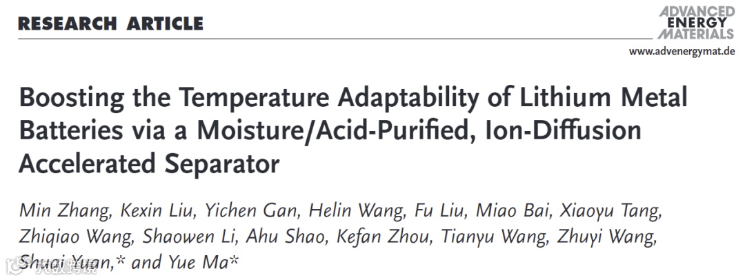 基于此,西北工业大学马越教授与上海大学袁帅教授合作,在国际顶级学术期刊Advanced Energy Materials上发表题为“Boosting the temperature adaptability of lithium metal batteries via a moisture/acid-purified, ion-diffusion accelerated separator”的研究型文章。