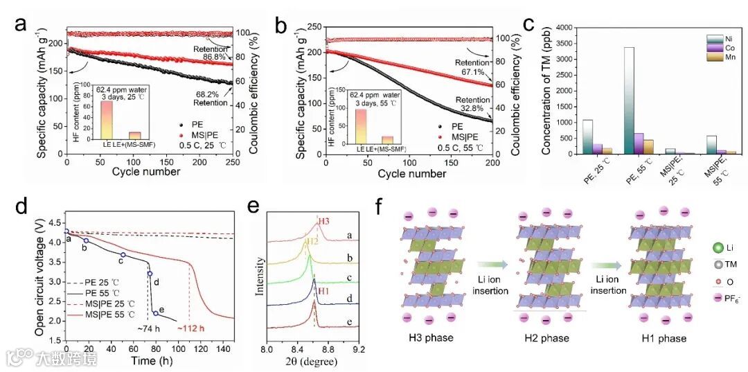 结果表明使用MS|PE隔膜组装的NCM811|Li电池在250次循环后的容量保持率为86.8%, 远高于PE 隔膜组装的电池 (68.2%)。而当温度升高至55°C时, MS-SMF涂层对电池容量保持率的提升作用更显著。通过探究不同温度下含H2O电解液中HF的产生量揭示了其性能提升原因。