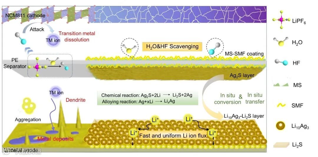 该文章设计了一种新型的Janus隔膜用以提升高压锂金属电池在传统酯基电解液中的循环稳定性。以超薄PE隔膜为基膜,在正极一侧,构筑的分子筛(MS)和磺化三聚氰胺甲醛缩合物(SMF)复合涂层用于捕获电解液中的HF和H2O残留物,从而提高电解液稳定性,抑制高压循环和高温储存时正极过渡金属溶出现象。