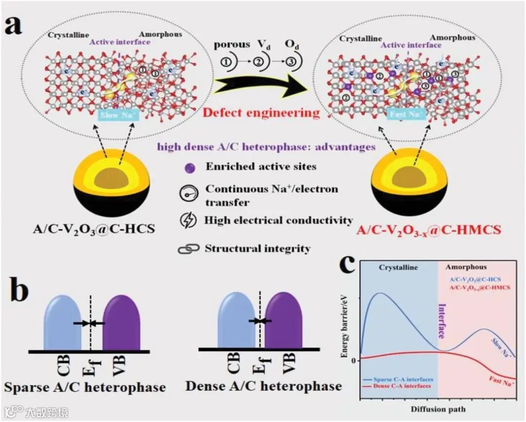 图 1. 界面缺陷工程示意图和高密度异质界面的电化学优势。a) A/C-V2O3@C-HCS和富含缺陷的A/C-V2O3-x @C-HMCS多孔结构模型,b) 带隙和 c) 扩散路径。