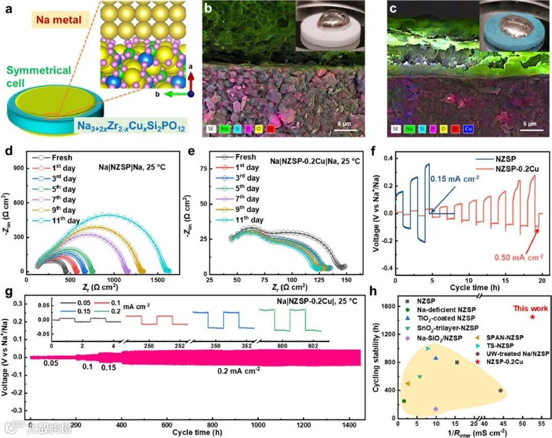 图2.(a)使用NZSP-xCu作为固体电解质的对称Na||Na电池示意图。SEM断面能谱图(b)Na/NZSP和(c)Na/NZSP-0.2Cu 插图为熔融Na金属照片。25°C下测量的(d)Na|NZSP|Na电池和(e)Na|NZSP-0.2Cu|Na电池的不同时间Nyquist图。(f) NZSP和NZSP-0.2Cu的临界电流密度。(g) Na|NZSP-0.2Cu|Na电池在0.05 ~ 0.2 mA cm−2电流密度逐步增加时的恒流充放电循环曲线。(h)NZSP-0.2Cu和其他NZSP基固体电解质之间的循环性能比较。