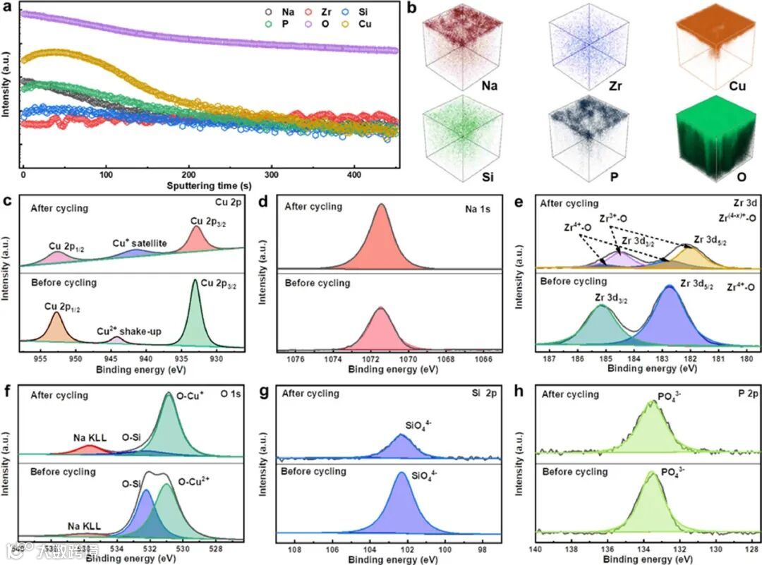 图3。(a)经过1450 h的嵌/脱钠循环后NZSP-0.2Cu表面的ToF-SIMS深度剖面和(b)相应的Na, Zr, Cu, Si, P, O等元素的三维模型图像。NZSP-0.2Cu嵌/脱钠循环循环前后的XPS光谱:(c) Cu 2p; (d)Na 1s;(e) Zr 3d;(f) O 1s;(g)Si 2p;(h) P 2p。