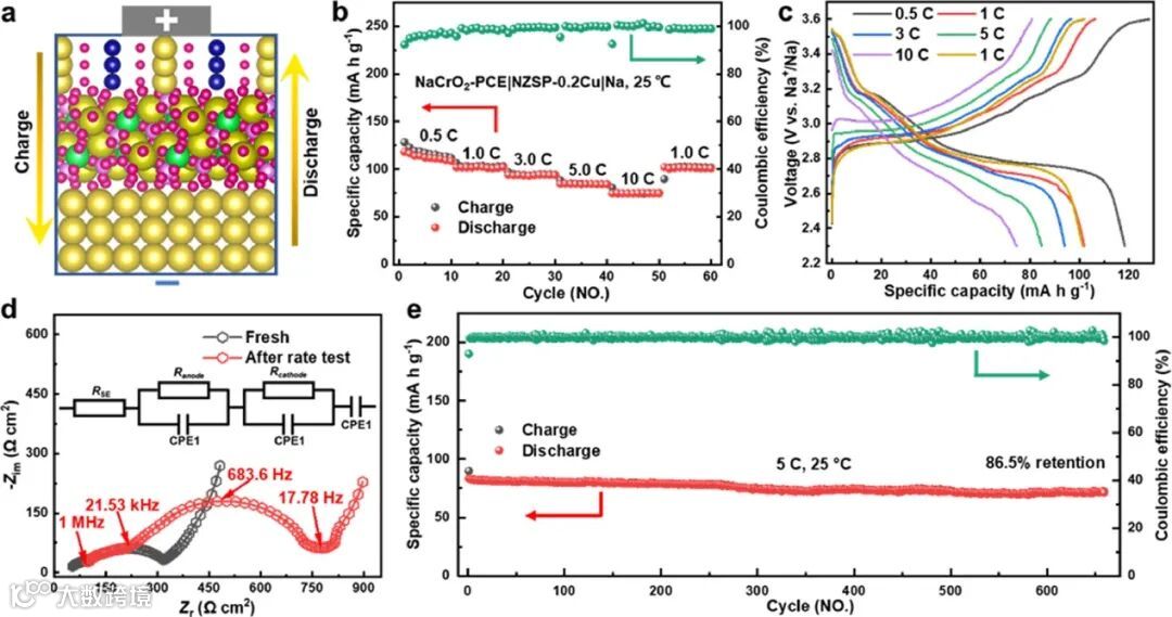 图5.(a)NaCrO2-PCE|NZSP-0.2Cu|Na固态钠金属电池示意图。黄(b) 在25°C测量的0.5-10 C电流密度下的倍率性能和(C)相应的充电/放电曲线。(d)测试前后电池的Nyquist图。(e)以5 C的恒定速率的循环性能。