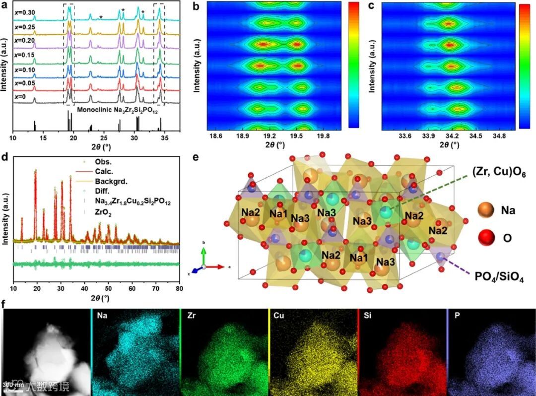 图1 材料表征 (a) Na3+2xZr2-xCux Si2PO12 (NZSP-xCu, x=0-0.3)样品的XRD谱图和(b) 18.5-20.0°和(c) 30.3-35.0°范围内的小角度XRD谱图。(d) Rietveld精修得到的XRD细化结果,(e) NZSP-0.2Cu的晶体结构和(f) TEM和EDS图像。