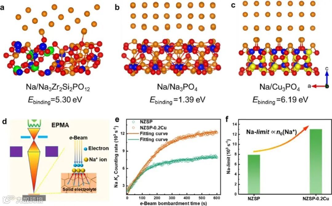 图4 界面处的模拟结合能(a)Na/ Na3Zr2Si2PO12(b)Na/Na3PO4(c)Na/Cu3PO4。(d)在电子束轰击下检测固体电解质Na镀层的EPMA测试示意图。(e)NZSP和NZSP-0.2Cu的Na Kα计数率-轰击时间曲线和(f)固体电解质中计算的Na极限。
