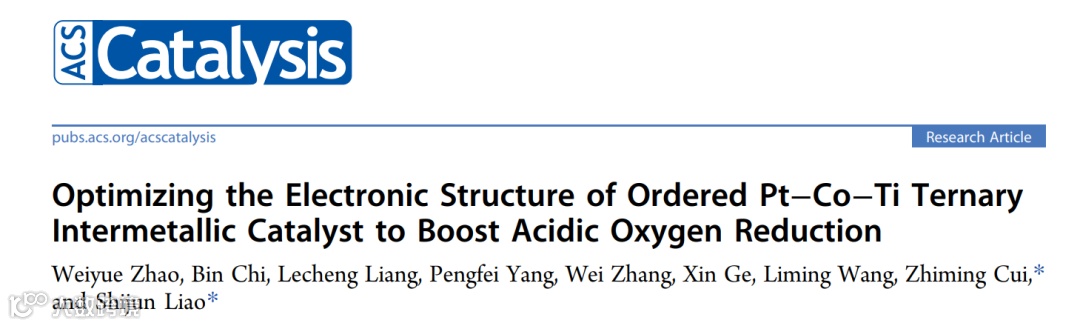 基于此,来自华南理工大学的燃料电池团队在国际知名期刊ACS Catalysis上发表题为“Optimizing the Electronic Structure of Ordered Pt–Co–Ti Ternary Intermetallic Catalyst to Boost Acidic Oxygen Reduction”的文章。第一作者为博士研究生赵伟悦和池滨, 通讯作者为廖世军和崔志明教授。
