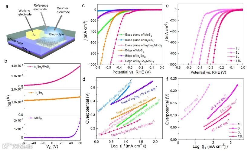 在单层MoS2堆叠13 L β-In2Se3的边缘,起始电位较低,Tafel斜率较小。因此,二维垂直异质结中优异的导电层与边缘重构对电子能级的优化和催化性能的提高起着决定性的作用。