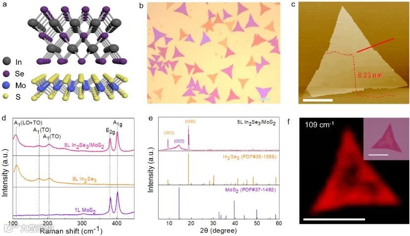 图1. In2Se3/MoS2异质结的合成和基本表征