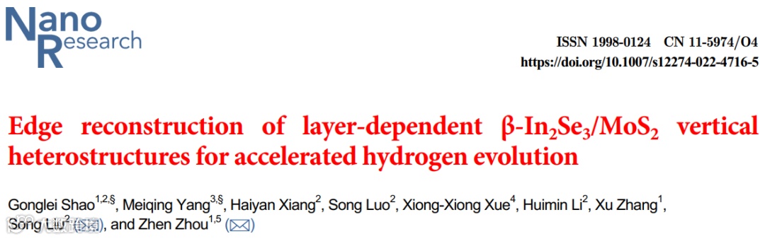 基于此,来自郑州大学邵功磊博士、湖南大学刘松教授和郑州大学周震教授合作,在知名期刊Nano Research发表的题为“Edge reconstruction of layer-dependent β-In2Se3 /MoS2 vertical heterostructures for accelerated hydrogen evolution”的文章。