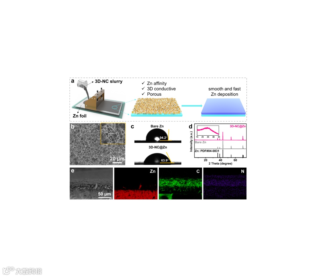 图1. a)3D-NC@Zn的制备过程示意图。3D-NC@Zn的b)SEM(正面),c)接触角和d)XRD图。e)3D-NC的SEM(截面)和相应的EDS mapping。