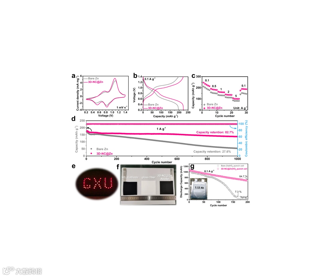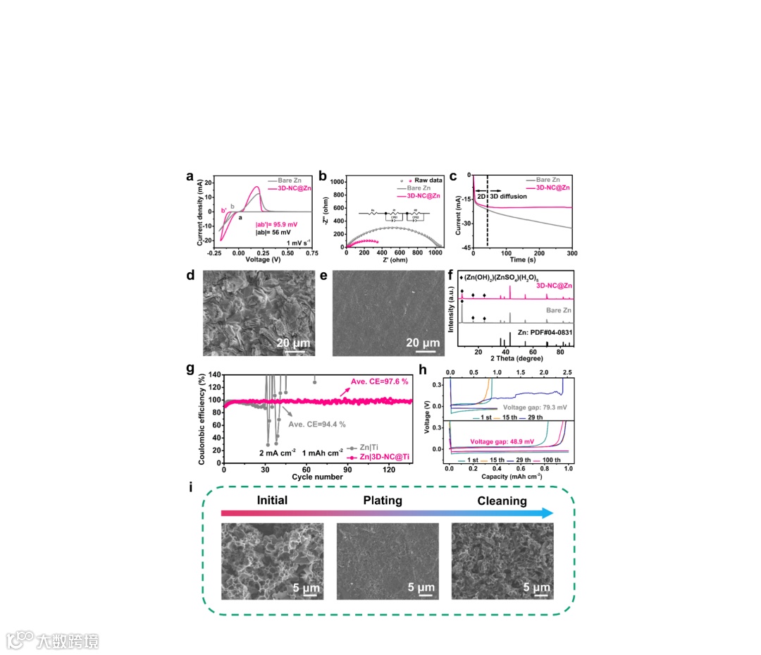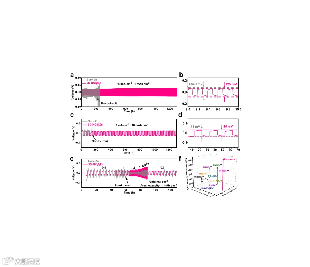 如图a所示,离子交换法制备的3D-NC通过刮刀法均匀地涂覆在锌负极上面,其独特的多孔结构有利于电解液在锌负极表面的浸润。此外,均匀分布的氮元素提高了3D-NC的亲锌性,能够均衡电极表面的离子浓度分布。同时,较大的孔道结构使得3D-NC界面层能够缓解锌沉积/剥离过程中带来的体积变化,从而保证了锌负极在反复充放电过程中的稳定性与优异的循环性能。