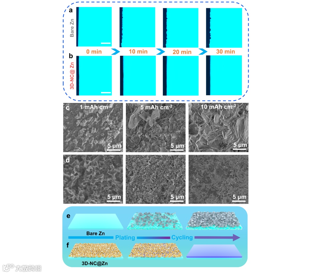 图5. a)裸锌和b)3D-NC@Zn的原位光学显微镜图像。c)裸锌和d)3D-NC@Zn在不同沉积面容量下的SEM图像。e)裸锌和f)3D-NC@Zn的锌沉积行为示意图。