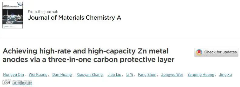基于此,广西大学何会兵助理教授在国际知名期刊Journal of Chemistry Materials A上发表题为“Achieving high-rate and high-capacity Zn metal anodes via a three-in-one carbon protective layer”的研究文章。